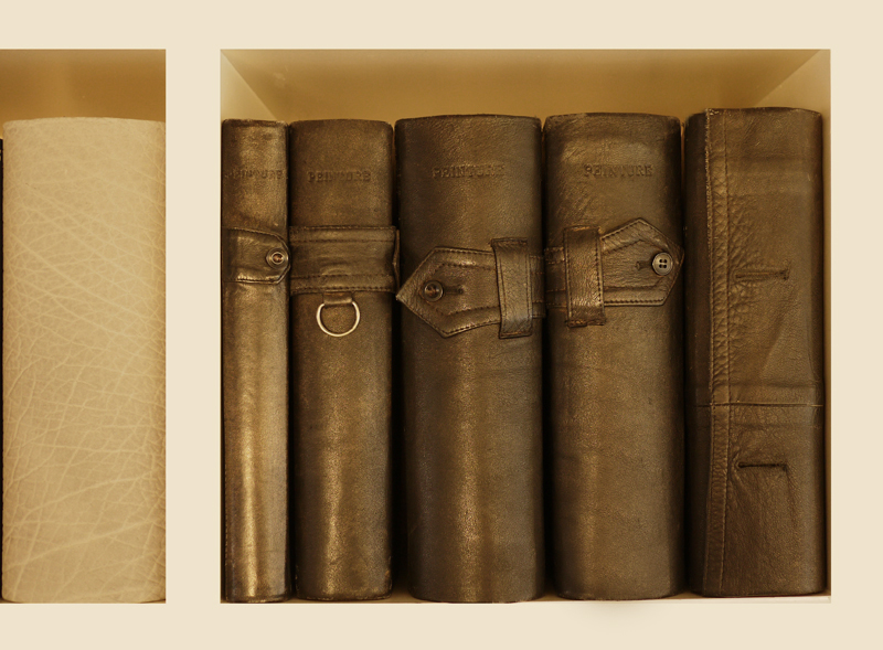 Les cinq livres ont été reliés avec le cuir du manteau du peintre : pattes de serrage, ceinture, pattes d’épaule, boutonnières en sont les emblèmes visibles sur le dos des livres.