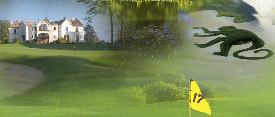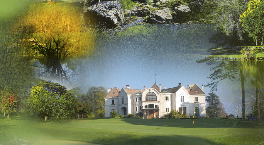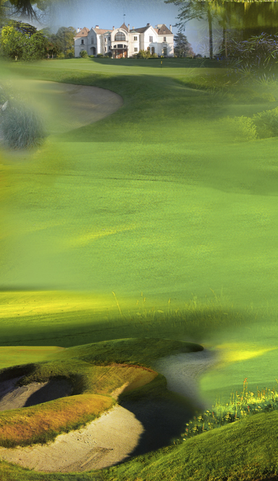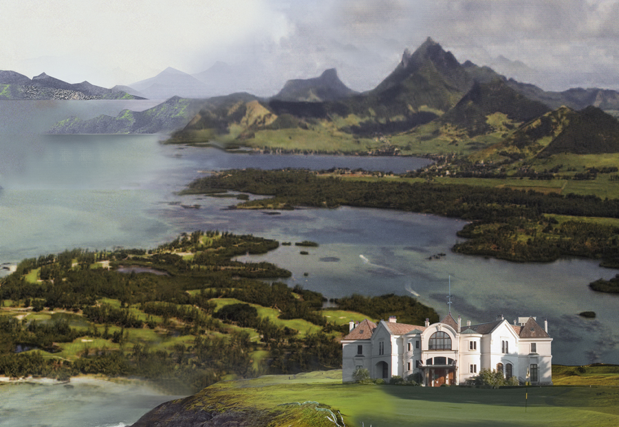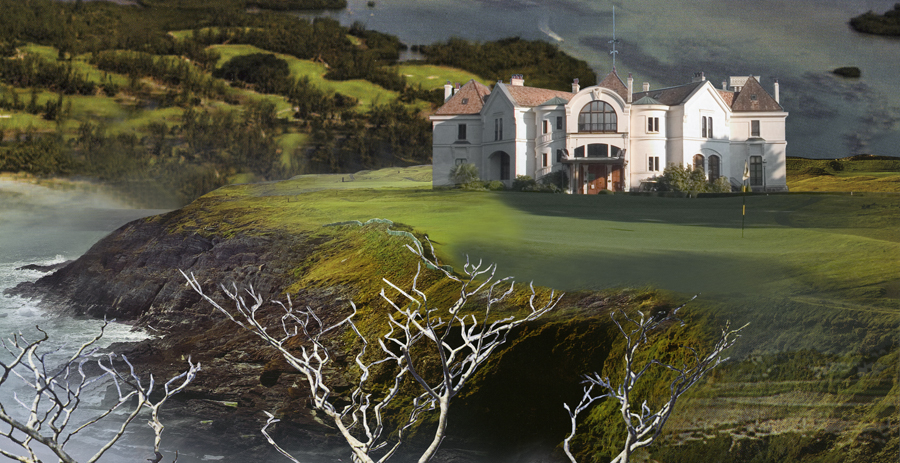 Le Club House du Golf Club du Domaine impérial est représenté sur le promontoire du Old Head Golf Club d’Irlande, en haut, à droite d’un « paysage » constitué d’un dix-huit trous, enrichi d’un neuf trous, sélectionnés parmi les parcours les plus réputés des cinq continents.