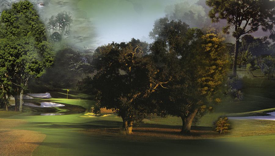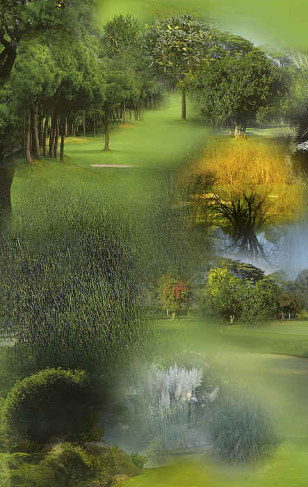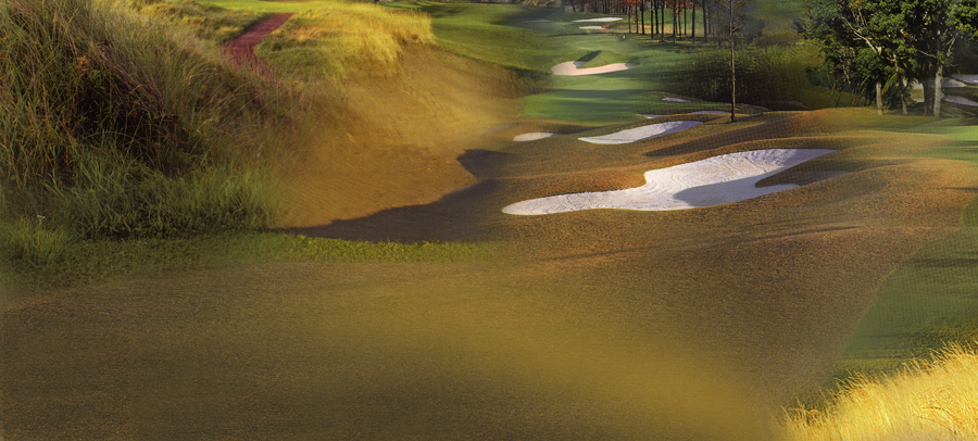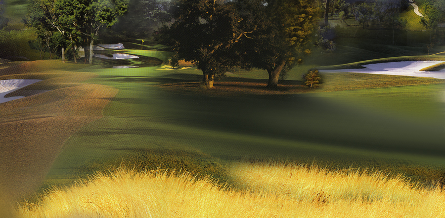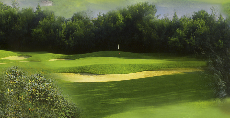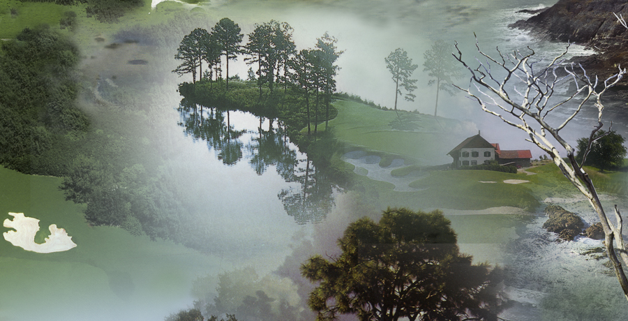 Et en dirigeant ses pas le long de ce rough, on est invité, par une ligne perspective, à pénétrer au centre du paysage : cette perspective est donnée par le fairway du Zuiryo Golf Club de Gifu, au Japon.En poursuivant cette ligne, on passe à côté des bunkers du Zuiryo, on traverse à droite le Rancho San Marco Golf Club de Santa Barbara, en Californie, avant d’atteindre le mythique trou nº12 de l’Augusta National Golf Club de Géorgie.