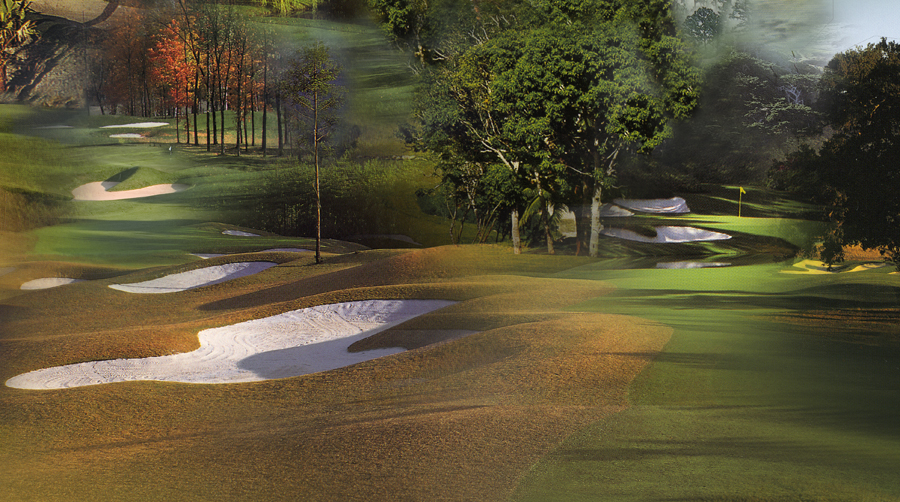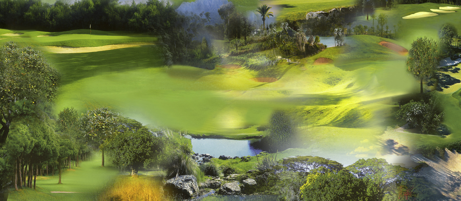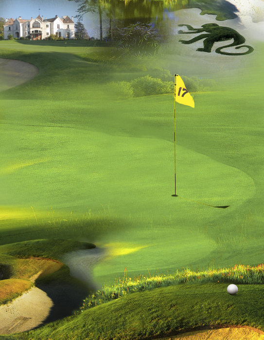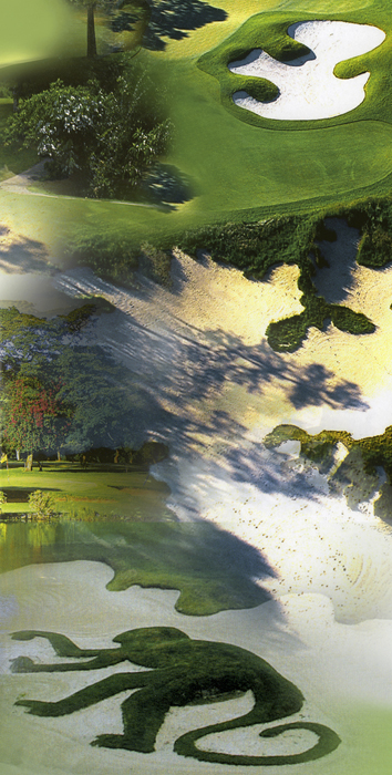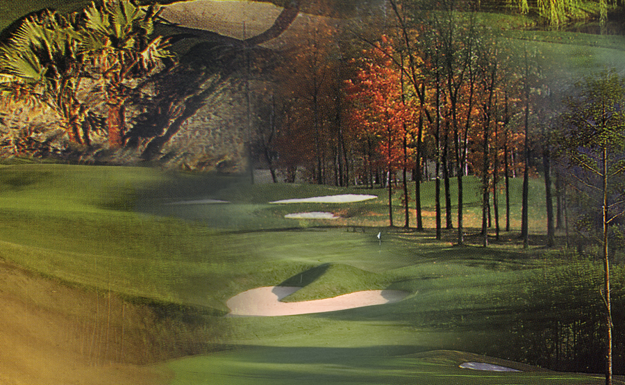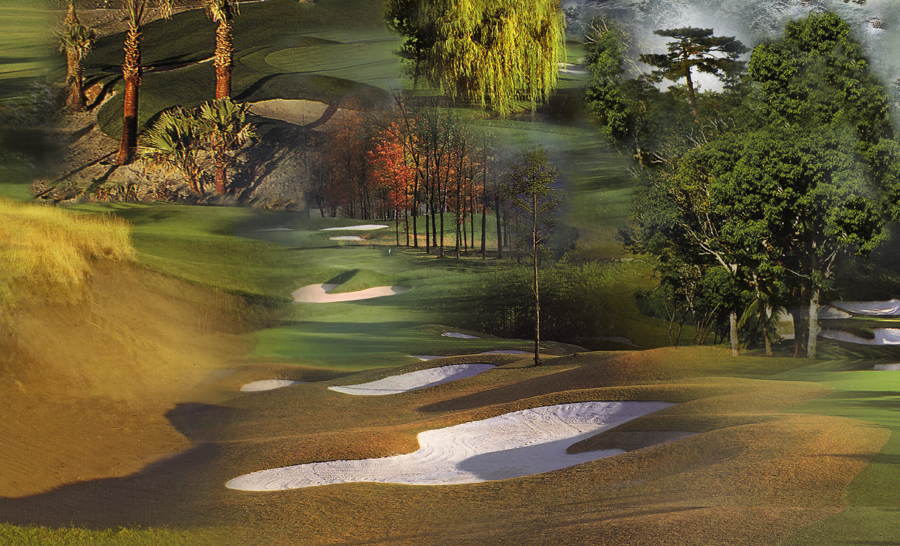« Le Club House du Golf Club du Domaine impérial est représenté au centre d’un « paysage », constitué de dix-huit trous sélectionnés parmi les parcours les plus réputés des cinq continents.