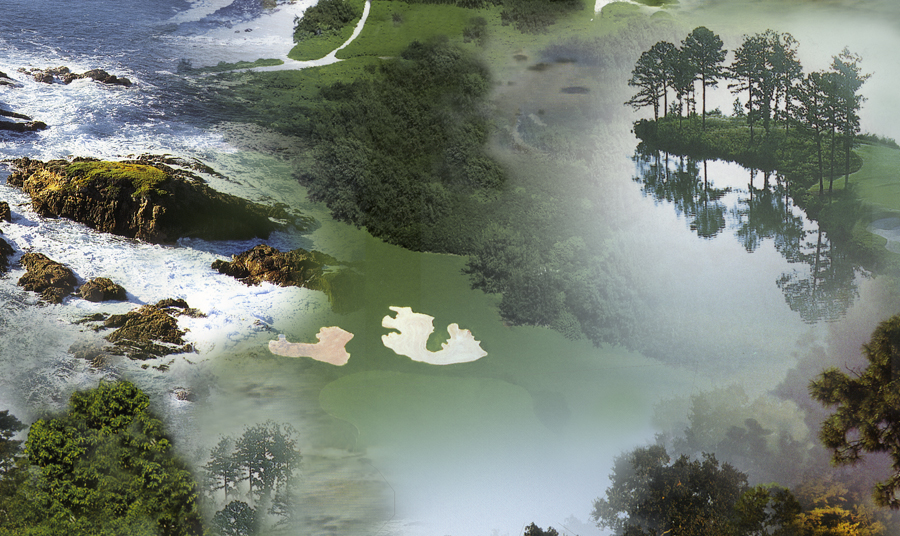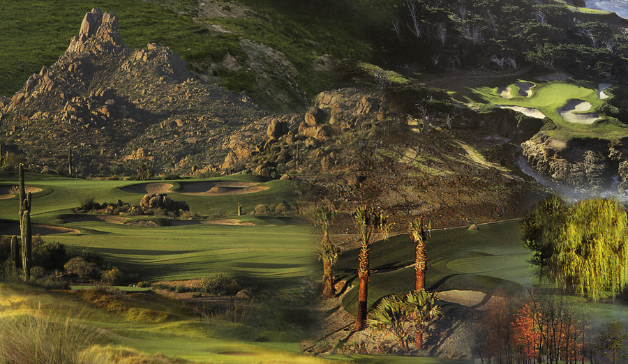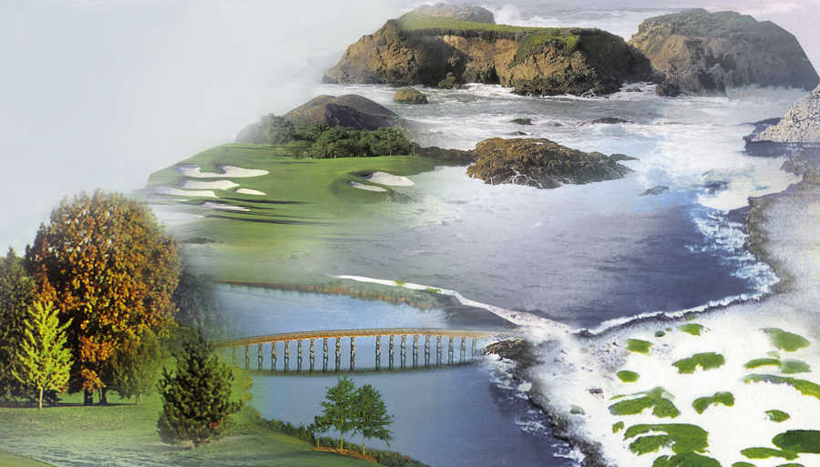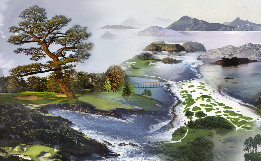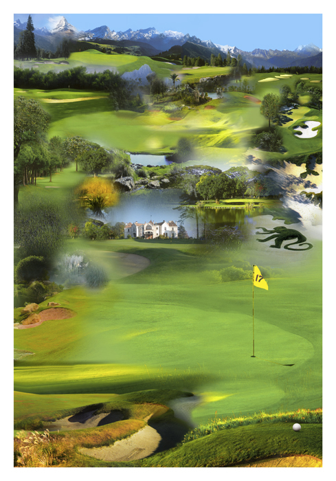 A la hauteur du trou bien ensoleillé de Pebble Beach, et, à sa gauche, on a le Pinnacle Course de Scottsdale, en Arizona, et, dans son prolongement vers le bas, le Quarry Golf Club de La Quinta, en Californie.Aux pieds de ses palmiers, on reconnaît le bunker en forme de cœur, qui défend l’accès du 17 au Domaine impérial, surplombé par une vue automnale sur des arbres du Wedgewood Golf & Country Club de Powell, dans l’Ohio, cerné de près, par une dune du St-Andrews Beach Club de Victoria, en Australie, dune surmontée d’un rough du Royal Birkdale Golf Club de Southport, dans le Lancashire, en Angleterre.