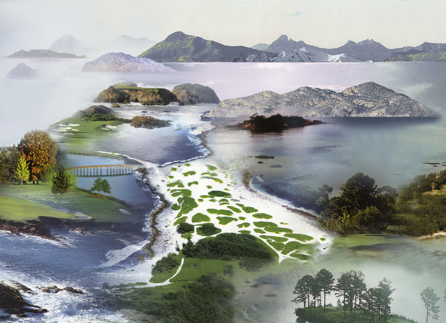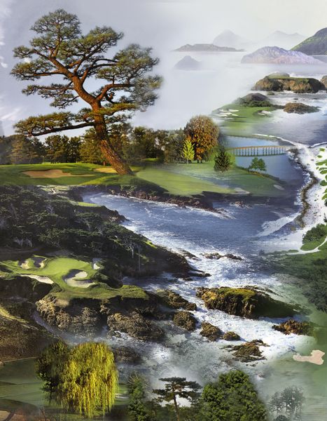 Puis, on s’élève en laissant à gauche le cirque de rochers du Cypress Point de Pebble Beach, et plus haut, le « bonzaï » japonais géant du Koga Golf Club, avec, à sa droite, un fragment de l’East Course d’Oak Hill de Rochester, New York.L’arbre japonais semble aimanté par les falaises irlandaises du Kilkee Golf Club, à l’extrême gauche de la composition.