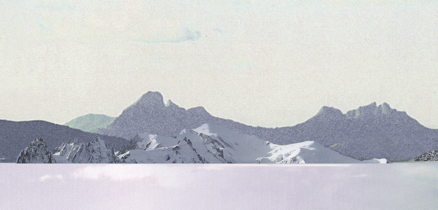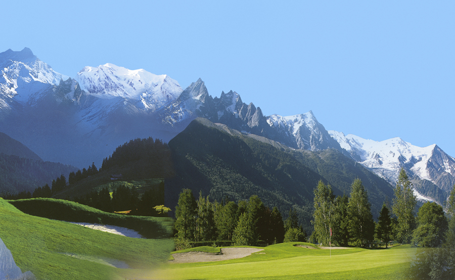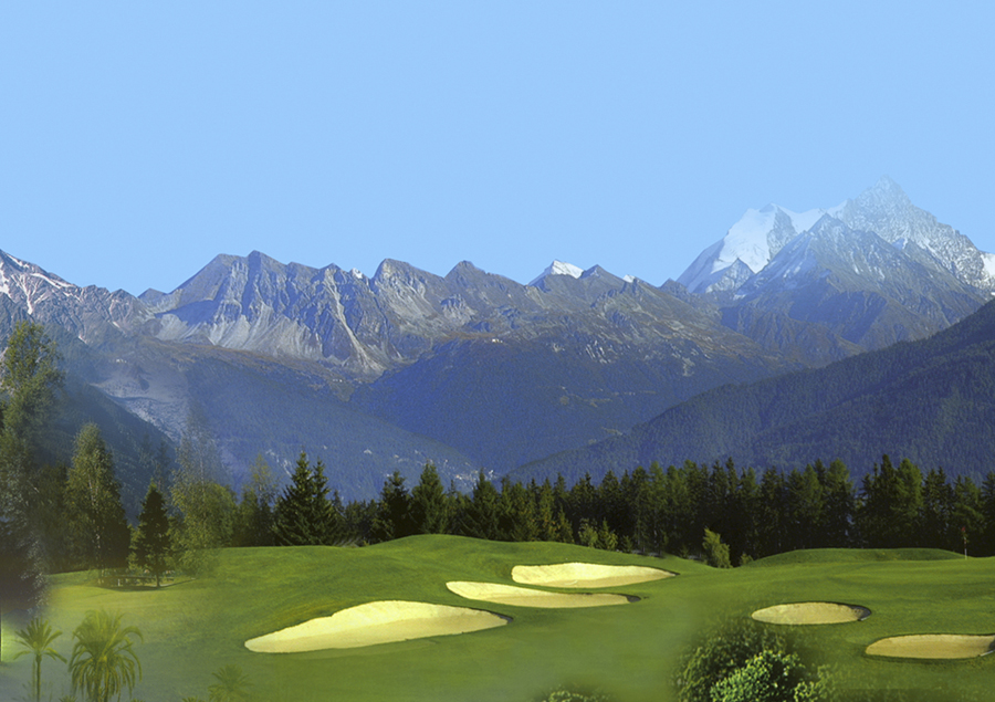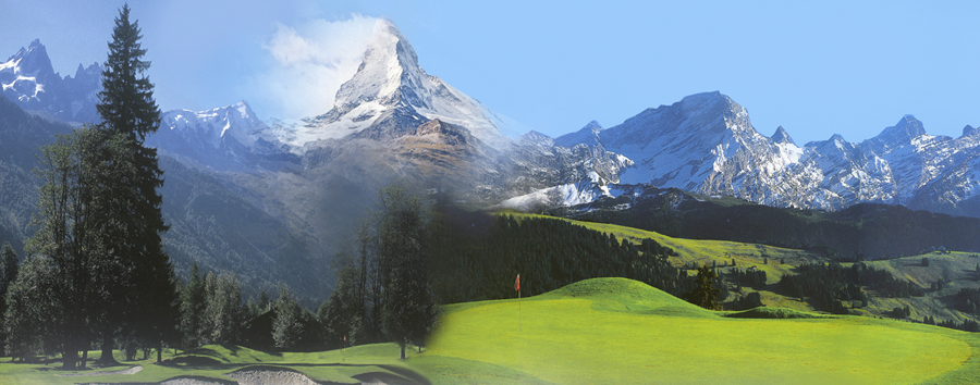 La chaîne de montagnes qui se profile en haut de la composition est formée de crêtes montagneuses vues, en partant du Cervin à gauche, du Golf Club Matterhorn à Zermatt, du Golf de Villars-sur-Ollon, du Golf Club de Chamonix, et tout à droite, du Golf Club de Crans-sur-Sierre (trou n0 7).