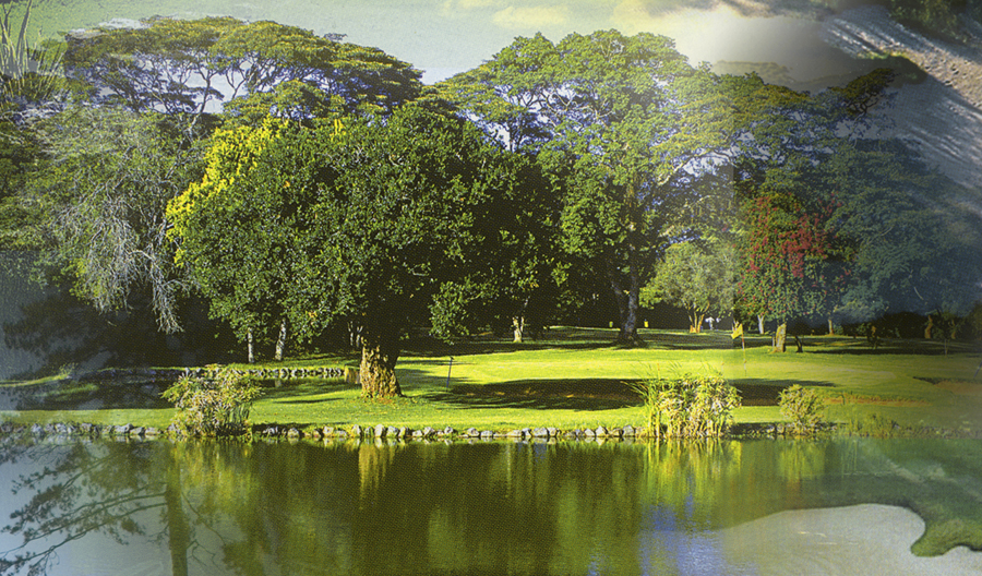 A sa droite, l’air et l’eau étendent plus loin leur dialogue de réflexion jusqu’à un fairway du Karen Golf & Country Club au Kenya, qui se prolonge jusqu’à un bunker du Green Monkey au Barbados Golf Club de La Barbade.