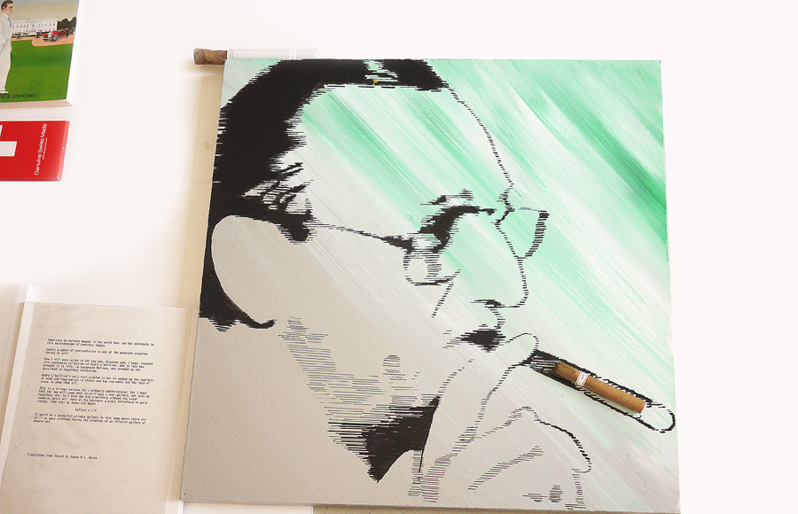 L’idée du peintre pour cette séance de portrait fut de s’adjoindre un « allié » supposé apporter un contrepoint visuel féminin à la présence du poète. L’alliée est une amie genevoise du peintre, Frédérique Friedling, cavalière émérite, artiste elle-même secrètement… et passionnée de littérature – en l’occurrence par les écrits d’Alexandre Voisard.