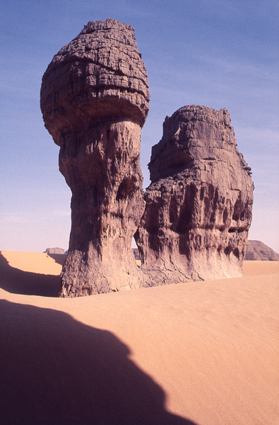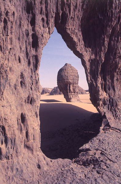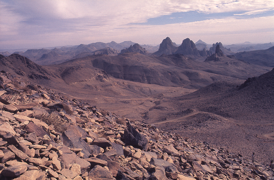 Le Hoggar, traversé par le Tropique du Cancer, est une étendue de pierre, un désert montagneux de roches volcaniques avec des coulées de basalte aux cristaux d’olivine et des éboulis de porphyre . L’érosion a façonné un paysage « surréaliste »… L’art de Max Ernst, de la période des « décalcomanies », ne semble qu’un pâle reflet devant la forêt « explosive fixe » du paysage saharien…