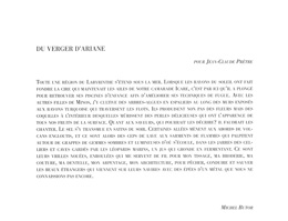 pour JEAN-CLAUDE PRÊTREToute une région du Labyrinthe s’étend sous la mer. Lorsque les rayons du soleil ont fait fondre la cire qui maintenait les ailes de notre camarade Icare, c’est par ici qu’il a plongé pour retrouver ses piscines d’enfance afin d’améliorer ses techniques de fugue. Avec les autres filles de Minos, j’y cultive des arbres-algues en espaliers au long des murs exposés aux rayons turquoise qui traversent les flots. Ils produisent non pas des fleurs mais des coquilles à l’intérieur desquelles mûrissent des perles délicieuses qui ont l’apparence de tous nos fruits de la surface. Quant aux saveurs, qui pourraient les décrire ? Il faudrait les chanter. Le sel s’y transmue en satins du soir. Certaines allées mènent aux abords de volcans engloutis, et ce sont alors des ceps de lave aux sarments de flammes qui palpitent autour de grappes de gemmes sombres et lumineuses d’où s’écoule, dans les jarres des celliers et caves gardés par les léopards marins, un jus qui gronde en fermentant. Ce sont leurs vrilles nouées, enroulées qui me servent de fil pour mon tissage, ma broderie, ma couture, ma dentelle, mon arpentage, mon architecture, pour pêcher, conduire et sauver les beaux étrangers qui viennent sur leurs navires avec des épées d’un métal que nous ne connaissions pas encore.