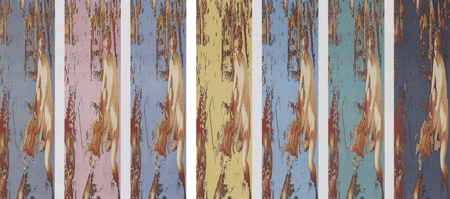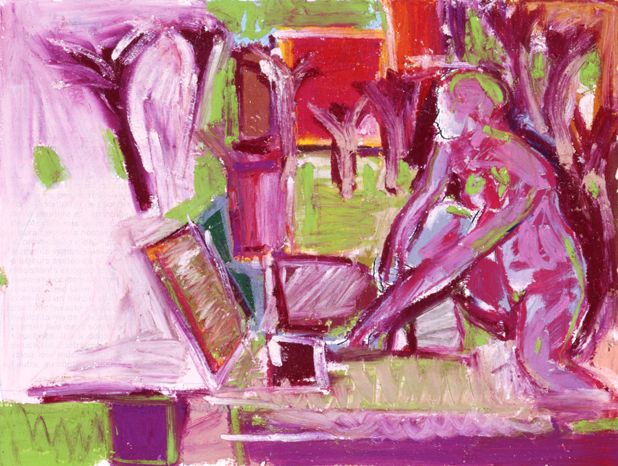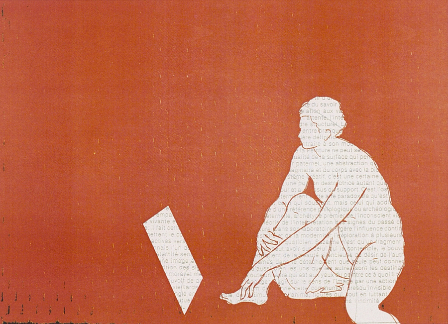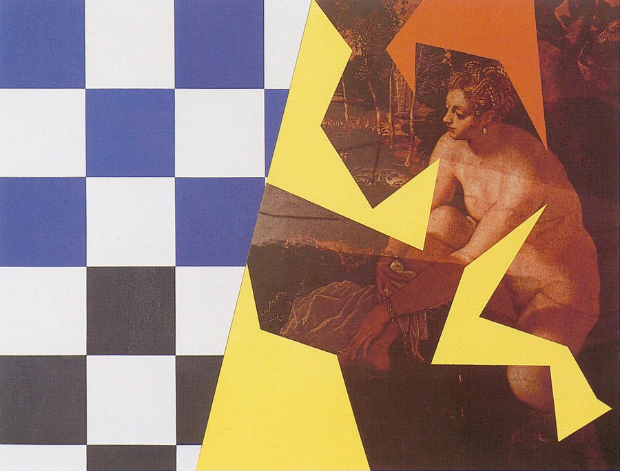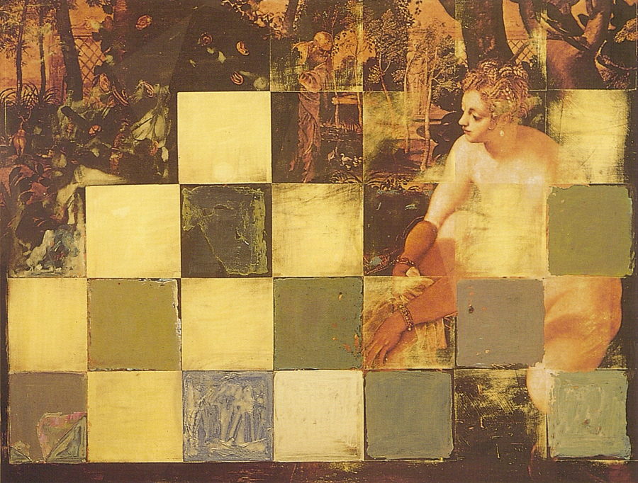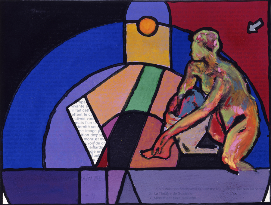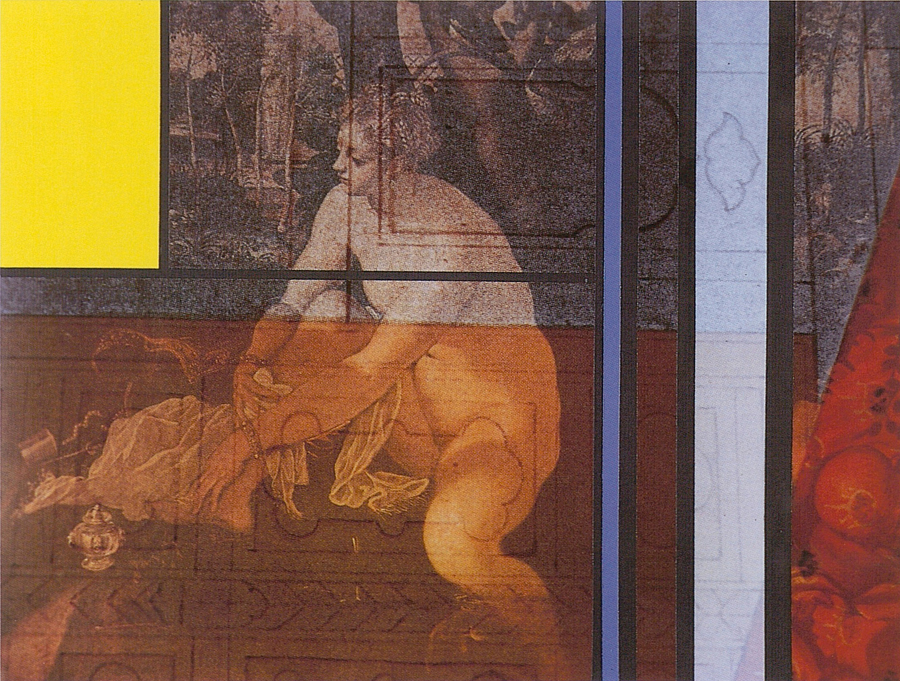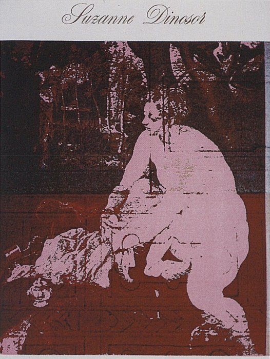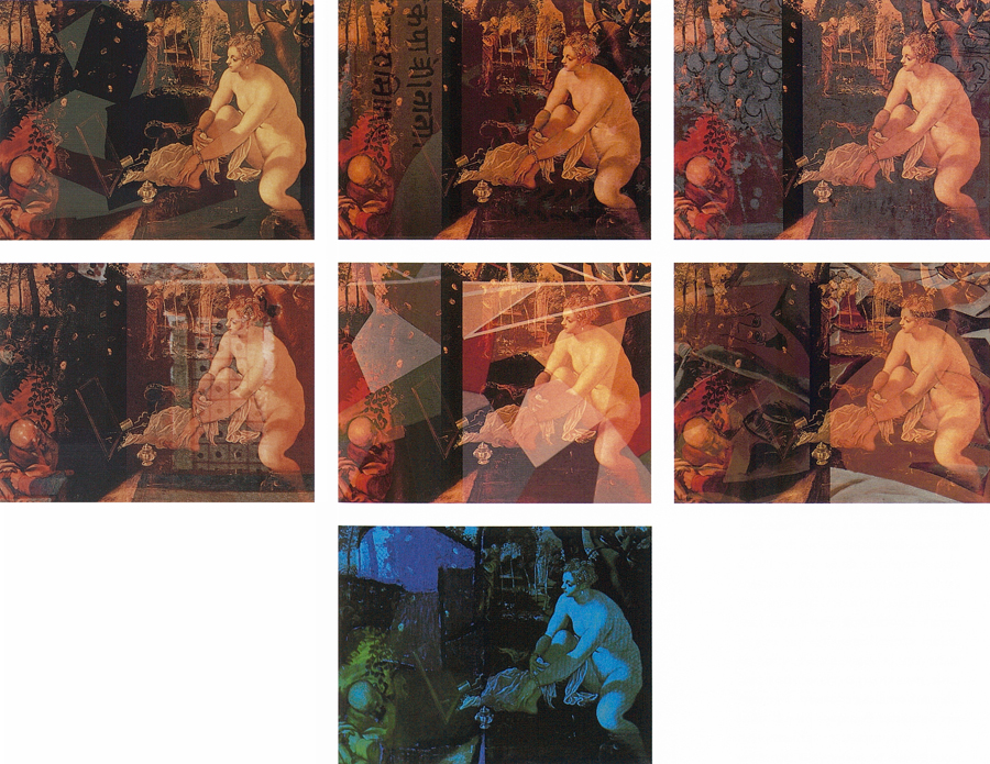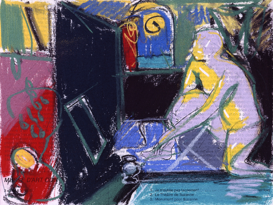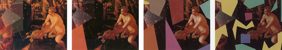 Elle disparaît sous des épanchements d’acrylique? C’est pour réapparaître éclaboussée de toutes les couleurs du prisme. Qu’elle se découpe à l’abri de persiennes, de paravents, de jalousies; qu’elle se tamise sous des gazes, des nappes de dentelles, qu’elle se dérobe sous les plis de tentures de damas ou des rideaux de plumes de paon, qu’elle se montre à demi couverte de damiers d’or ou d’ebène froissés, qu’elle se métamorphose ou qu’elle s’anamorphose, en long, en large ou qu’au travers de petits trous elle s’exhibe par petits bouts, qu’elle se mondrianise, se baconise, qu’elle s’artnégrise, se japanise, se kandinskise, qu’elle se matisse, se manetise, se picasse ou s’altère à la Klee… Devant son miroir, Suzanne est là quelque part.