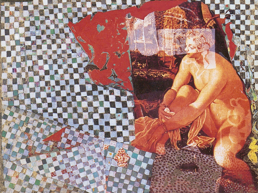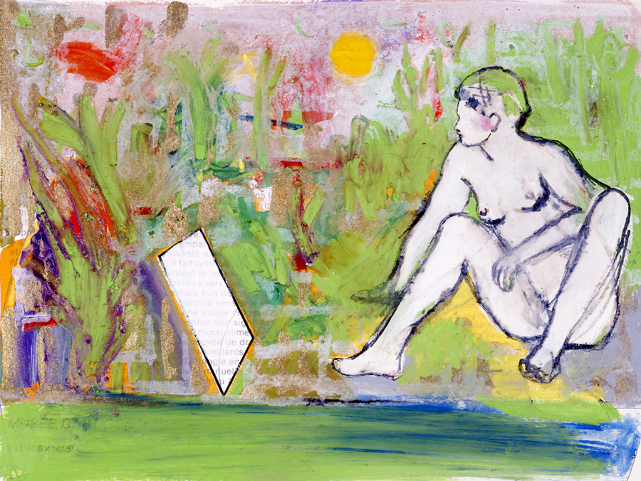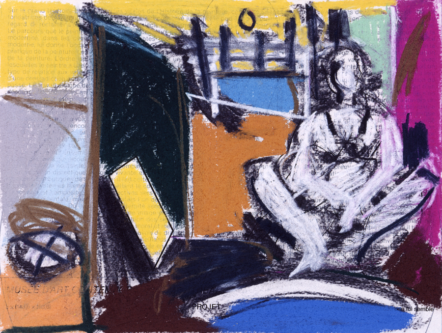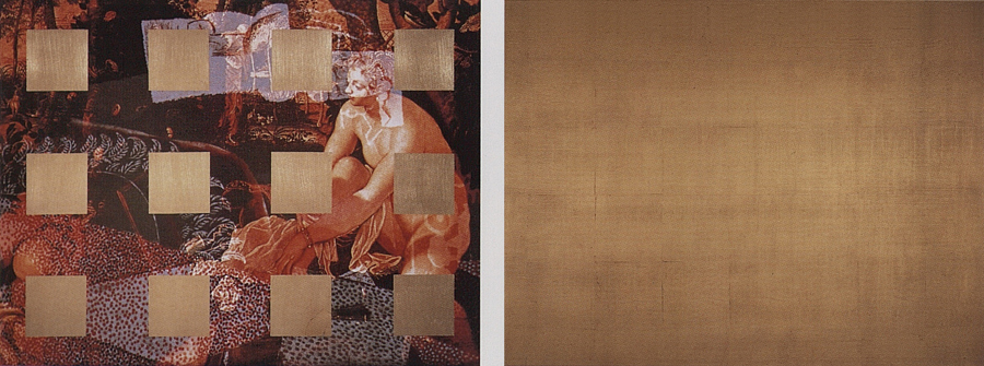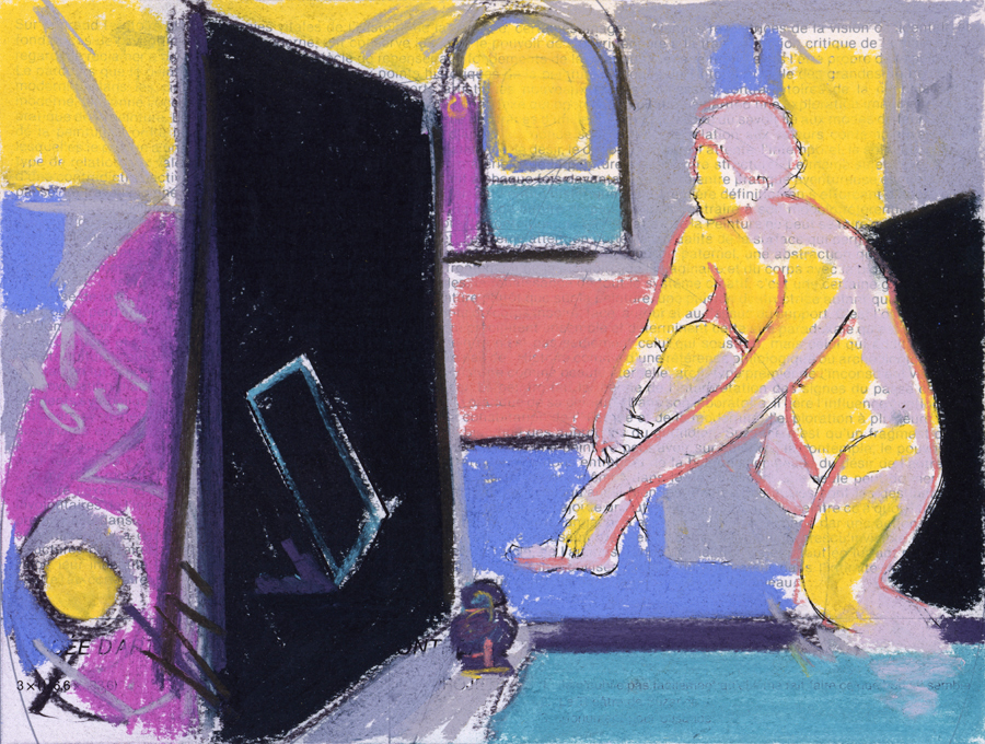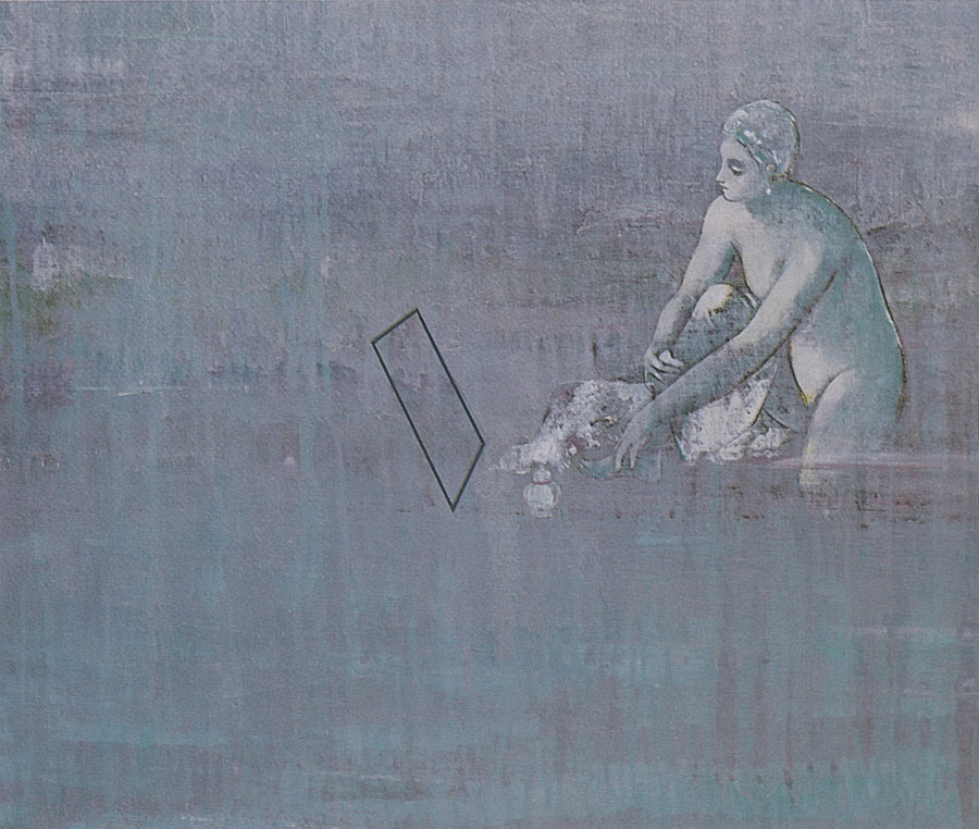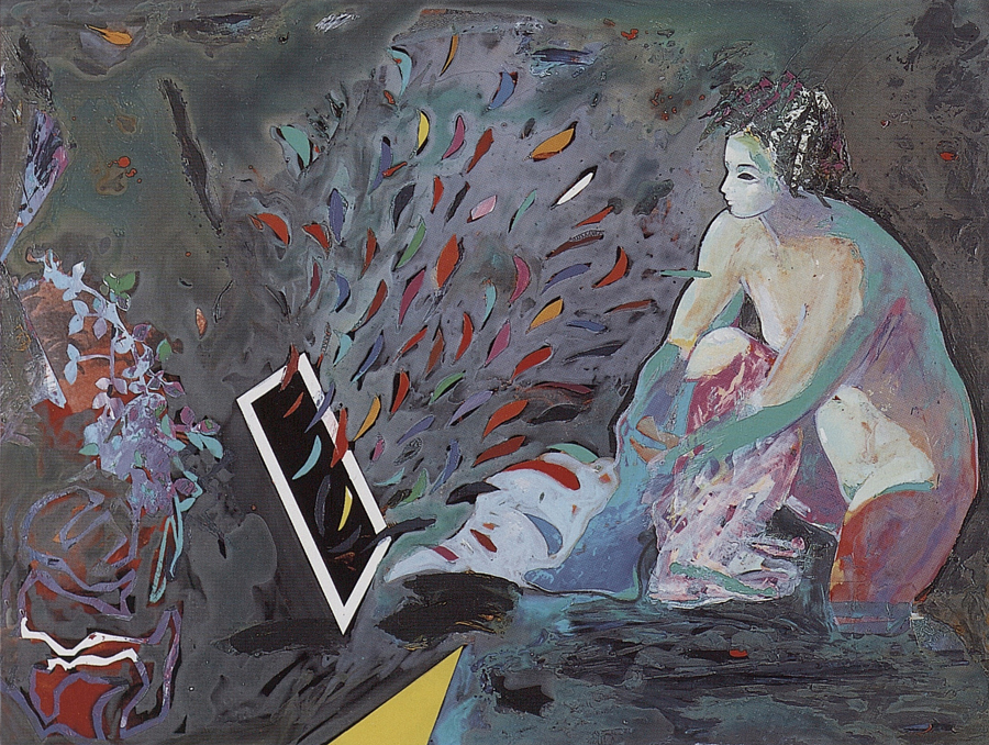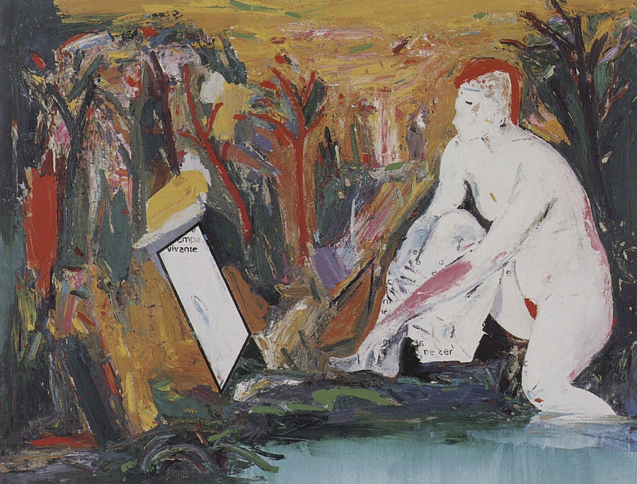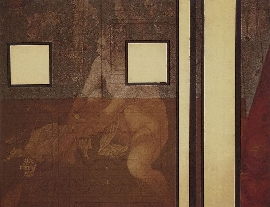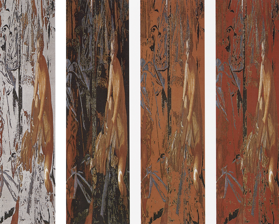 Elle disparaît sous des épanchements d’acrylique? C’est pour réapparaître éclaboussée de toutes les couleurs du prisme. Qu’elle se découpe à l’abri de persiennes, de paravents, de jalousies; qu’elle se tamise sous des gazes, des nappes de dentelles, qu’elle se dérobe sous les plis de tentures de damas ou des rideaux de plumes de paon, qu’elle se montre à demi couverte de damiers d’or ou d’ebène froissés, qu’elle se métamorphose ou qu’elle s’anamorphose, en long, en large ou qu’au travers de petits trous elle s’exhibe par petits bouts, qu’elle se mondrianise, se baconise, qu’elle s’artnégrise, se japanise, se kandinskise, qu’elle se matisse, se manetise, se picasse ou s’altère à la Klee… Devant son miroir, Suzanne est là quelque part.