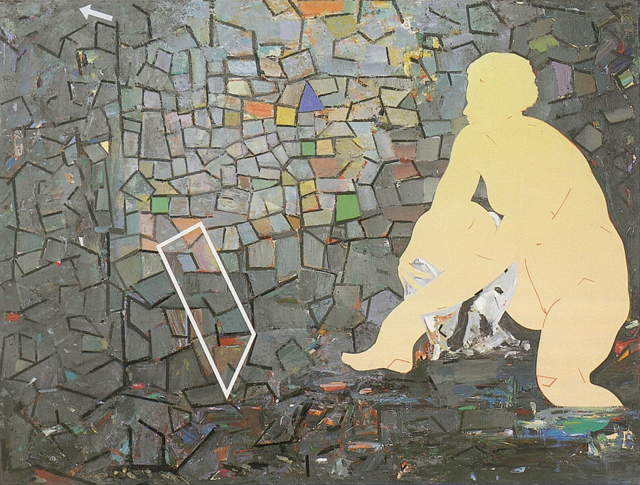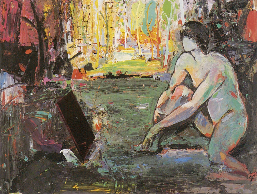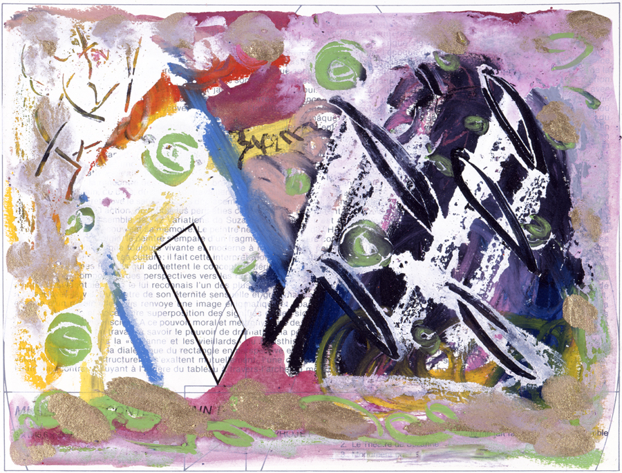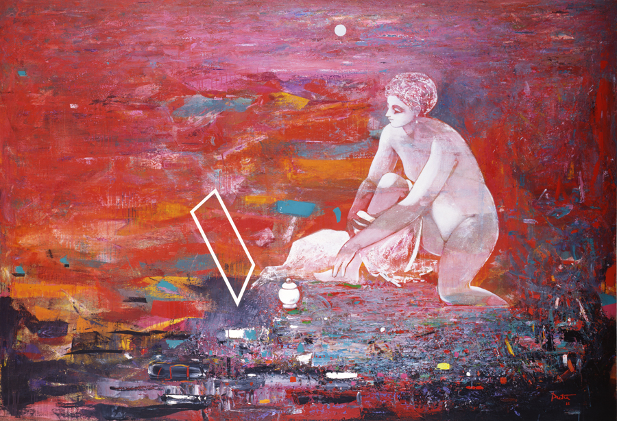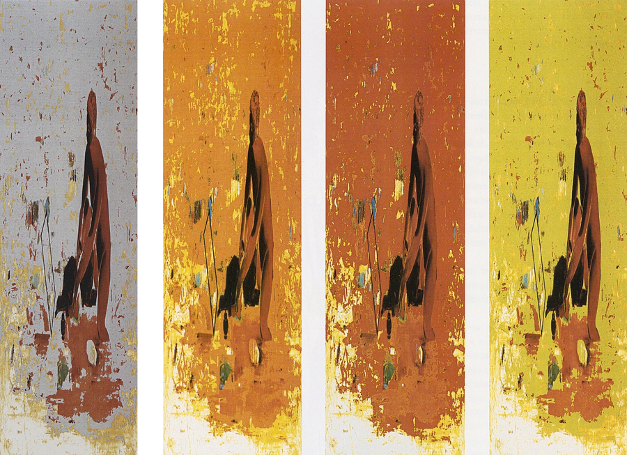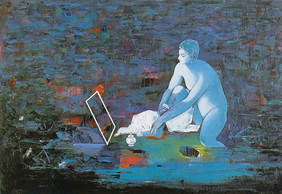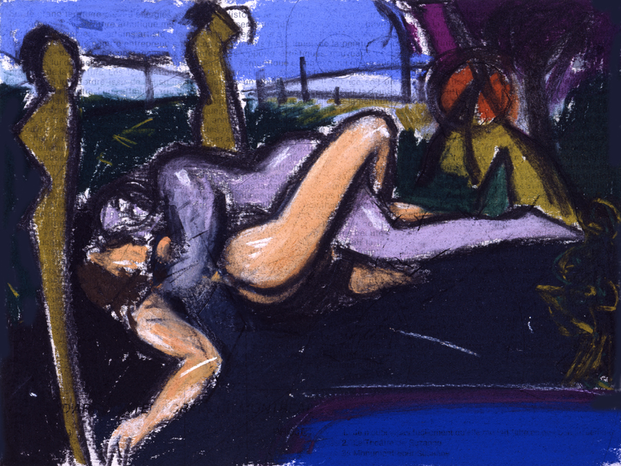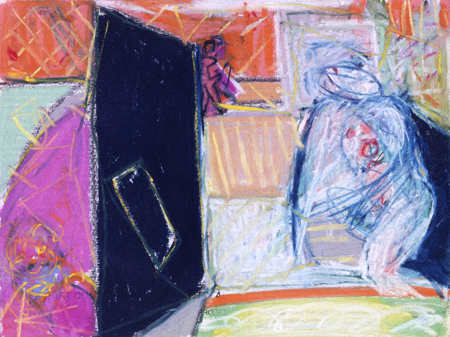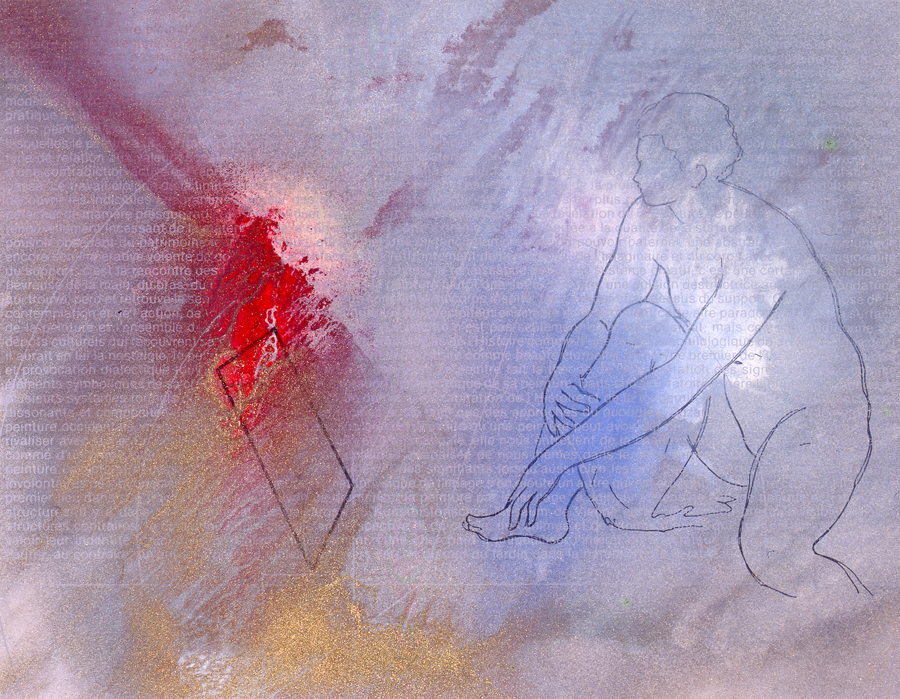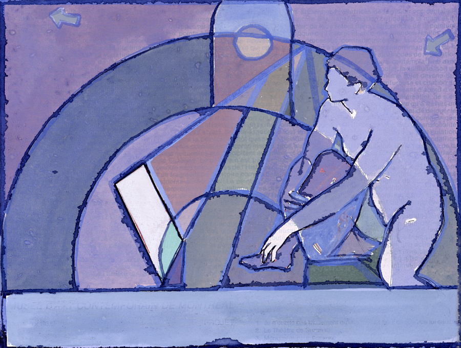Elle disparaît sous des épanchements d’acrylique? C’est pour réapparaître éclaboussée de toutes les couleurs du prisme. Qu’elle se découpe à l’abri de persiennes, de paravents, de jalousies; qu’elle se tamise sous des gazes, des nappes de dentelles, qu’elle se dérobe sous les plis de tentures de damas ou des rideaux de plumes de paon, qu’elle se montre à demi couverte de damiers d’or ou d’ebène froissés, qu’elle se métamorphose ou qu’elle s’anamorphose, en long, en large ou qu’au travers de petits trous elle s’exhibe par petits bouts, qu’elle se mondrianise, se baconise, qu’elle s’artnégrise, se japanise, se kandinskise, qu’elle se matisse, se manetise, se picasse ou s’altère à la Klee… Devant son miroir, Suzanne est là quelque part.