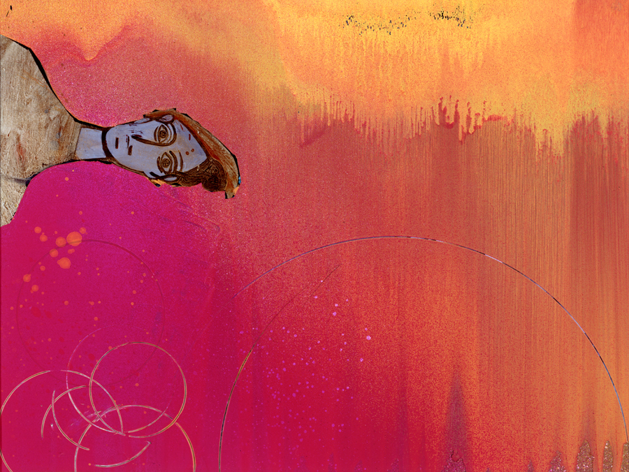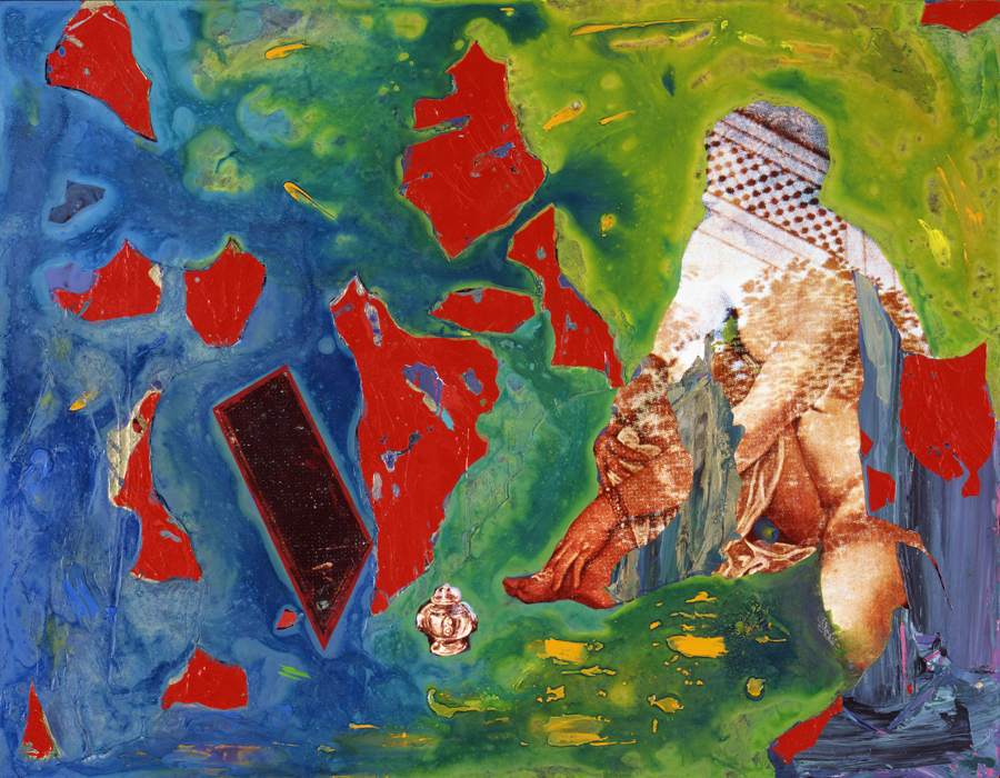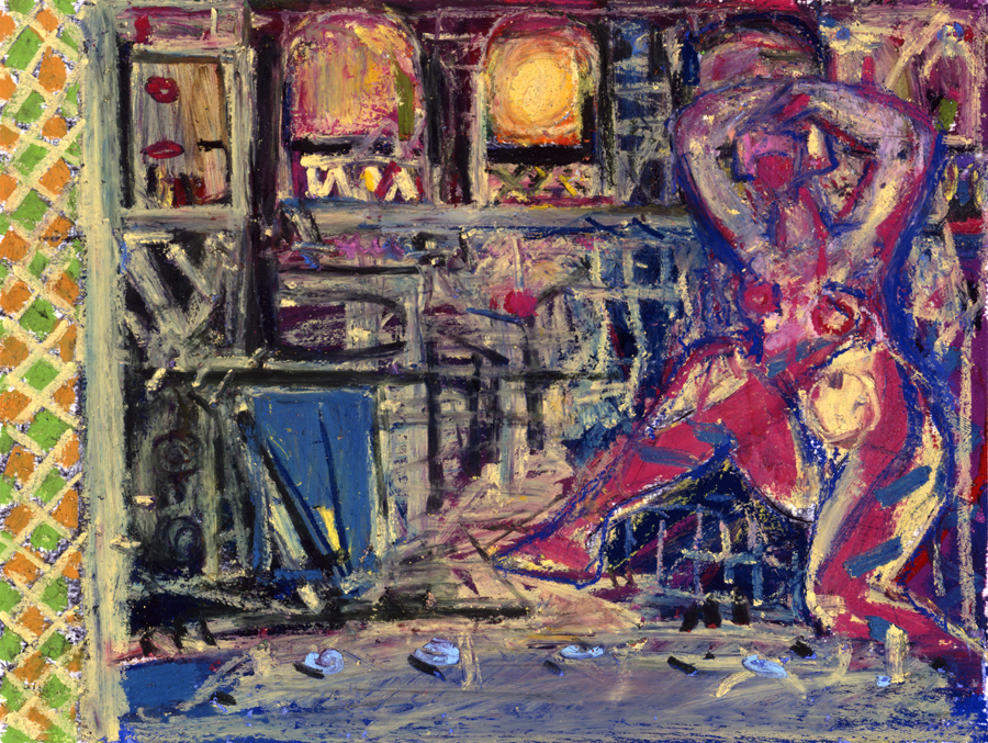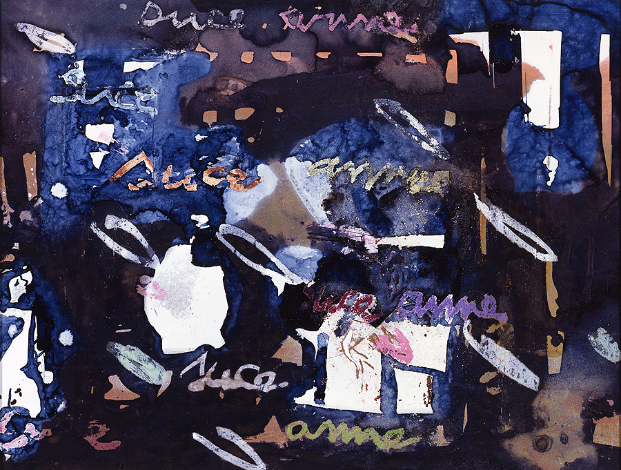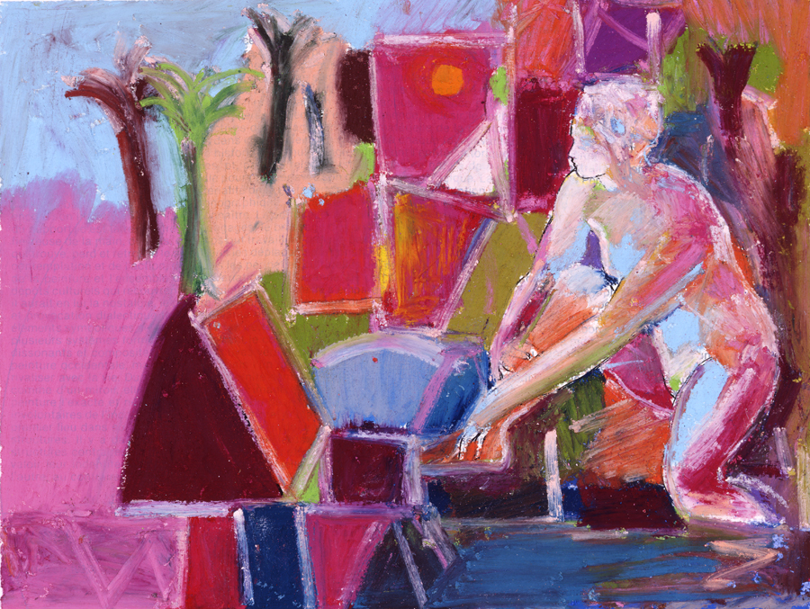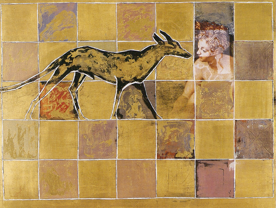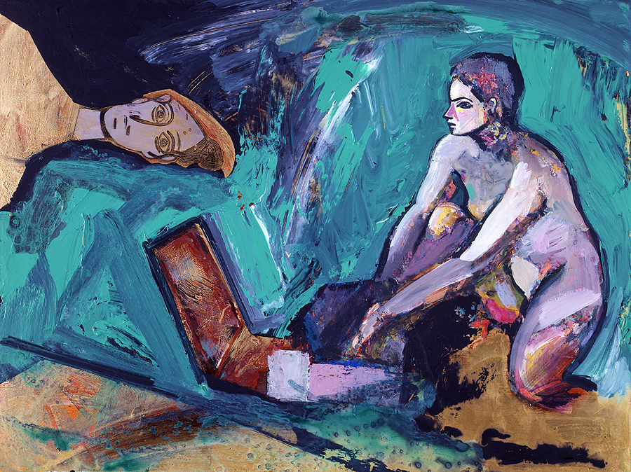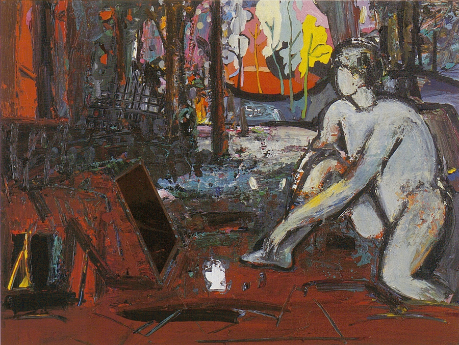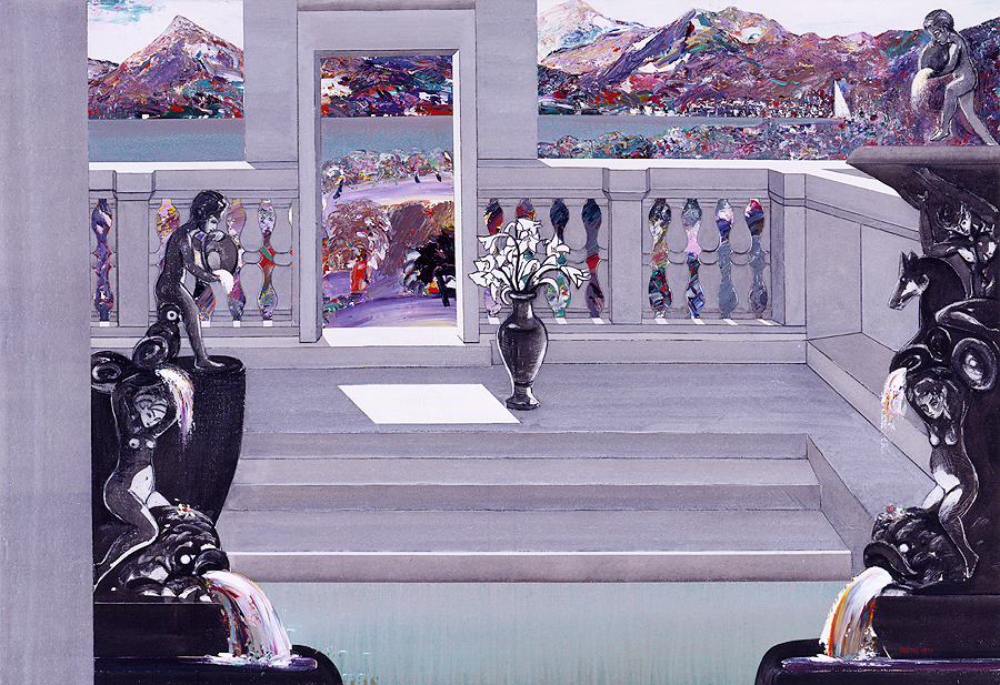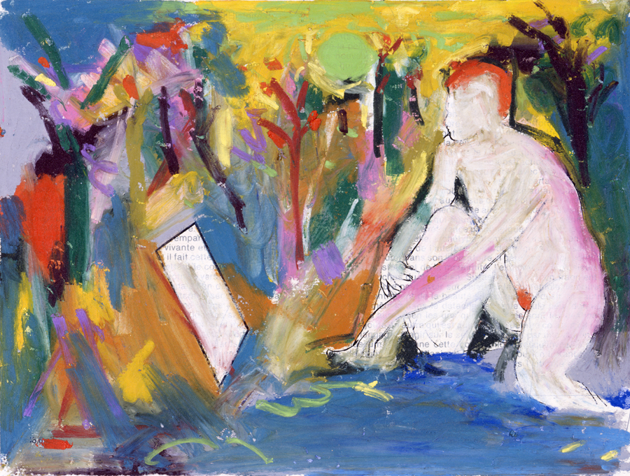 Elle disparaît sous des épanchements d’acrylique? C’est pour réapparaître éclaboussée de toutes les couleurs du prisme. Qu’elle se découpe à l’abri de persiennes, de paravents, de jalousies; qu’elle se tamise sous des gazes, des nappes de dentelles, qu’elle se dérobe sous les plis de tentures de damas ou des rideaux de plumes de paon, qu’elle se montre à demi couverte de damiers d’or ou d’ebène froissés, qu’elle se métamorphose ou qu’elle s’anamorphose, en long, en large ou qu’au travers de petits trous elle s’exhibe par petits bouts, qu’elle se mondrianise, se baconise, qu’elle s’artnégrise, se japanise, se kandinskise, qu’elle se matisse, se manetise, se picasse ou s’altère à la Klee… Devant son miroir, Suzanne est là quelque part.