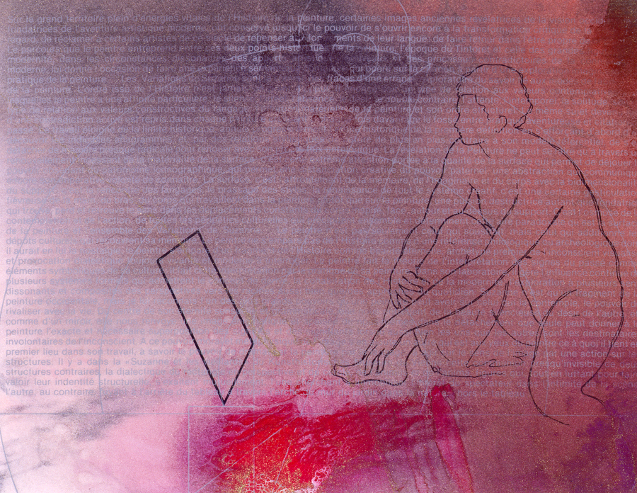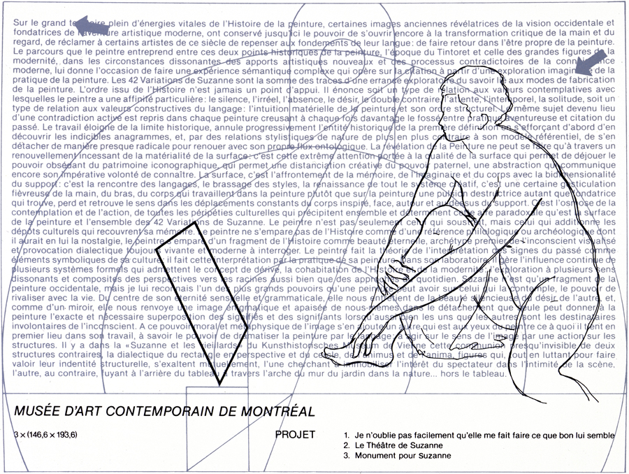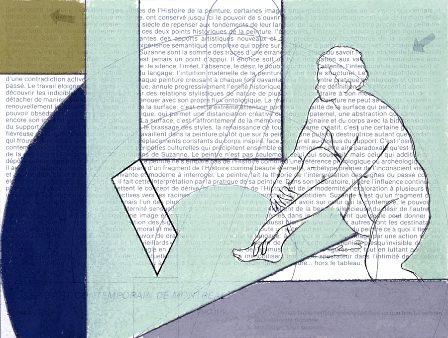 » Peindre Suzanne de telle manière qu’elle ne soit pas plus dans le jardin que dans le lieu de la toile où la tradition l’a mise, peindre Suzanne de telle manière qu’elle ne soit plus un élément agencé parmi d’autres, un élément d’assemblage, mais qu’elle recouvre tous les lieux de la toile, qu’elle imprègne toute la surface de la peinture, qu’elle devienne la texture même du tableau : le fait même de la peinture. »