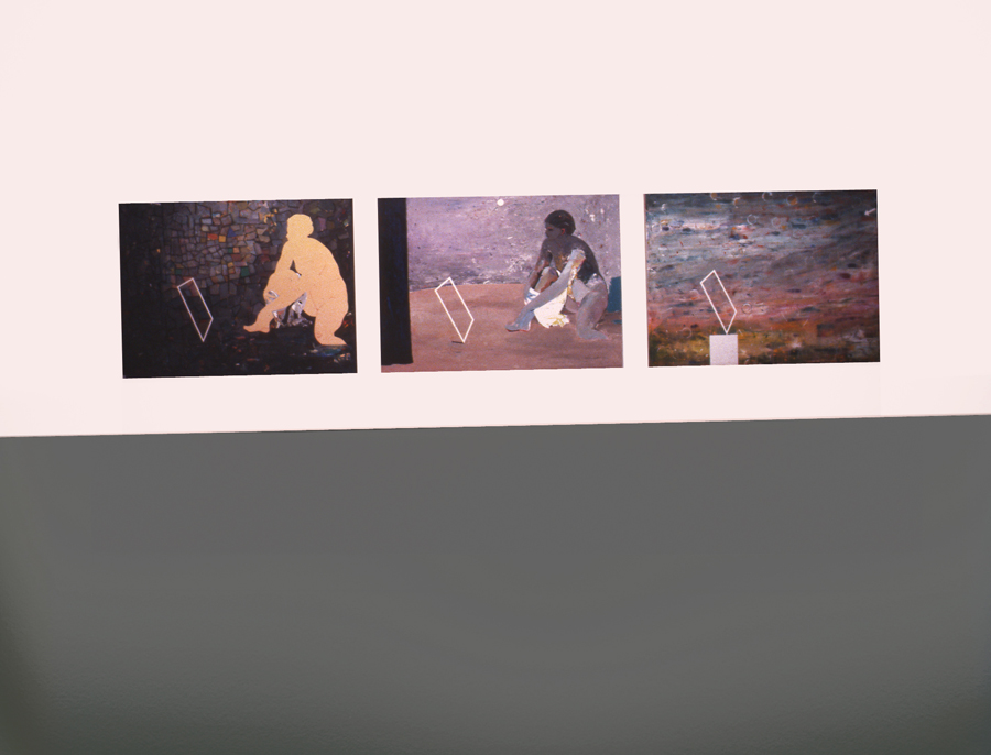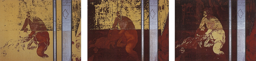 La première toile représente une Suzanne médiévale dans un espace bidimensionnel, la toile centrale une Suzanne de la Renaissance dans un espace avec perspective, et la troisième, une Suzanne « peinture » dans un espace contemporain abstrait.