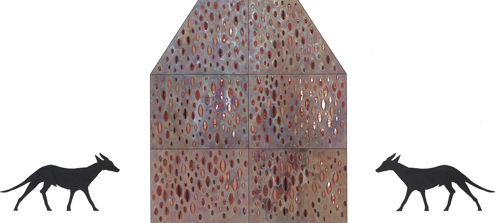 L’arrière-fond peut venir au premier plan, ses croisillons se resserrer, revêtir la structure d’yeux de mouches vus dans un microscope. Le panneau de la haie se referme, piqué d’étranges fleurs avec un trou à la place du cœur. Je sais que Suzanne est là, quelque part, devant son miroir…