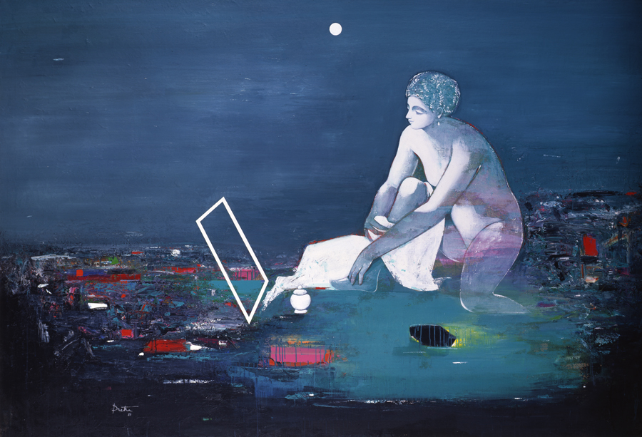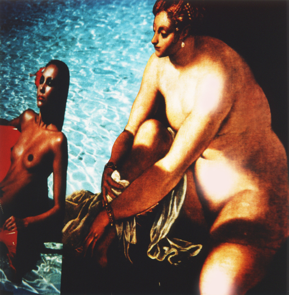 Toujours la même, toujours une autre. Successivement, ou en même temps. Triptyque. Polyptyque. Panoptique: car même le spectacle promis par Titien au roi d’Espagne se réalise, quoique nous ne soyons invités à y assister qu’en qualité de premier valet de chambre, du dehors, l’œil collé à quelque boutonnière heureusement ménagée dans le matériau constituant les parois d’une volière cosmique, à l’intérieur de laquelle Suzanne, brillant comme mille soleils en image, devient une constellation de mirages, — que dis-je ? un univers infini dont le centre est partout et la circonférence nulle part. Accomplissement hyperbolique, à côté d’autres, diversement paraboliques. Mais, depuis le temps qu’on en parle, et qu’on la peint, Suzanne n’est-elle pas devenue matière inépuisable à paraboles autant qu’à hyperboles? L’a-t-on jamais mieux fait paraître unique qu’en l’altérant à toutes sortes de sources, en la plongeant dans toutes sortes de bains, comme le fait J.-C. Prêtre?