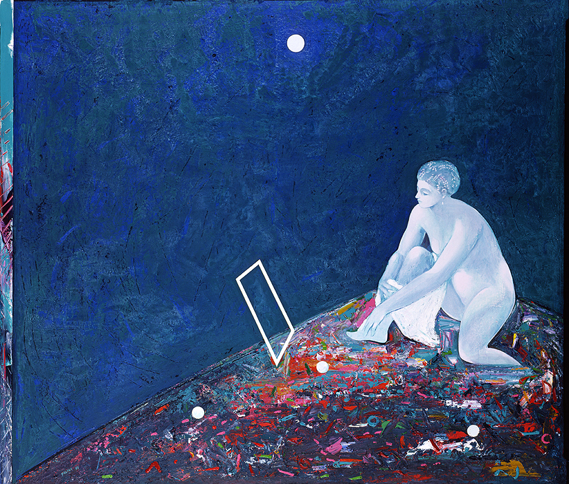 L’ambition du peintre a été que cette œuvre soit l’une des plus exemplaires variations de sa Suite Suzanne au sens où il a souhaité qu’elle synthétise le plus grand nombre de ses paramètres essentiels tout en s’insérant harmonieusement dans le lieu auquel elle était destinée, c’est-à-dire tant dans sa relation culturelle avec le Pavillon d’imagerie médicale que dans sa relation – nommons-là : thérapeutique – avec les patients qui auraient à la contempler voire à la supporter… Il s’agissait, en ne cédant à aucun compromis, de créer une image poétique à vocation contemplative avec des éléments iconographiques subtils mais accessibles et susceptibles d’apporter un peu de rêve et de réconfort.