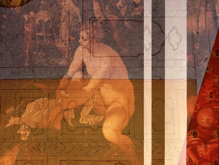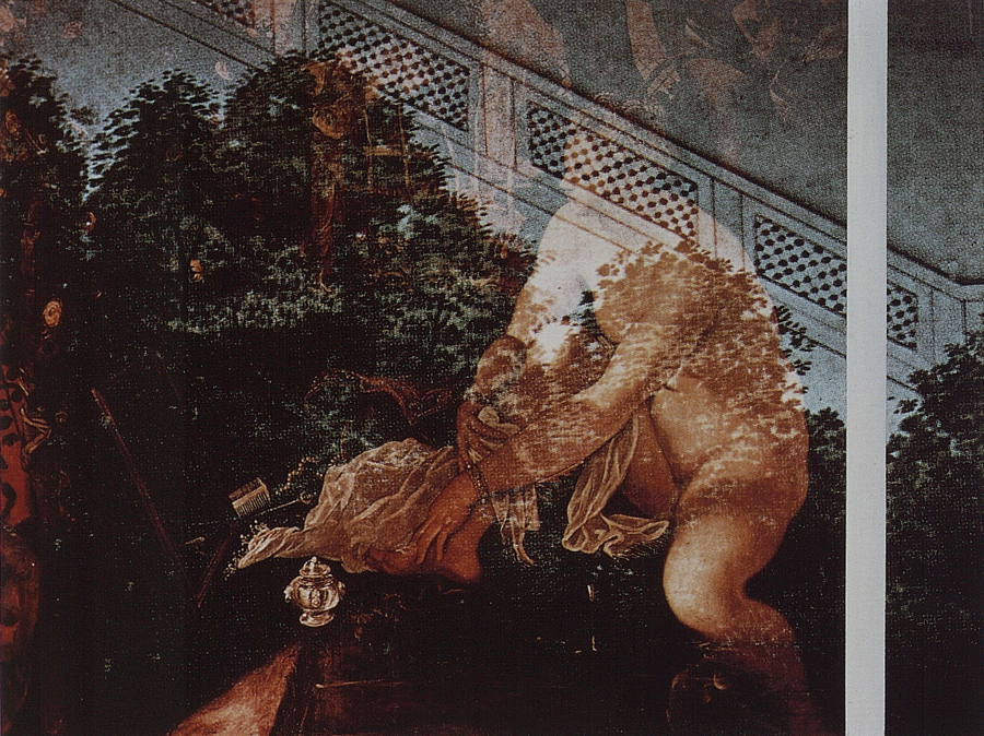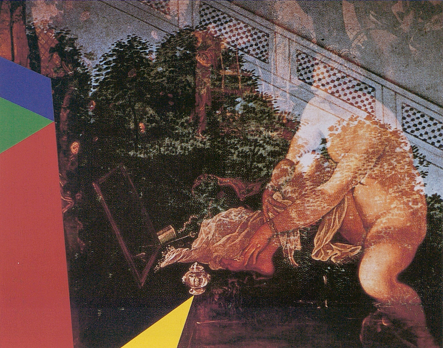 Je dirai seulement que tout le dispositif savamment construit par Tintoret s’ébranle et s’anime. Les plans verticaux, horizontaux, obliques — surfaces transparentes, opaques, ajourées, miroitantes —, qui en constituaient les pièces maîtresses, glissent, coulissent, se rabattent, se projettent l’un sur l’autre. La perspective se déprave. Des révolutions s’opèrent, autour du pivot du flacon à parfum, qui joue le rôle de lanterne magique : d’autres jardins s’imaginent, irrigués d’autres eaux reflétant d’autres deux, plantés d’autres essences, aux odeurs plus suaves, ou plus violentes. Suzanne ne continue pas moins de s’y baigner…