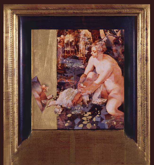 La petite Suzanne médiévale qui prend sagement son bain de pieds provient d’une miniature enluminée d’un manuscrit de la Bibliothèque universitaire de Genève. A cette époque, Suzanne était encore une Sainte : elle incarnait la valeur éthique de l’histoire. Plus tard, durant la Renaissance, elle sera une femme plus proche de Vénus que de la Vierge. Les deux lapins noir et blanc, aux yeux injectés, sont une allusion aux deux « chauds lapins » duplices de la Bible. Le chien palette est une présence familière qui a accompagné Suzanne dans de nombreux tableaux.