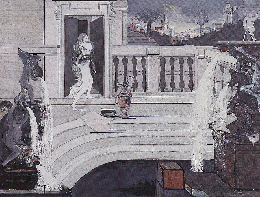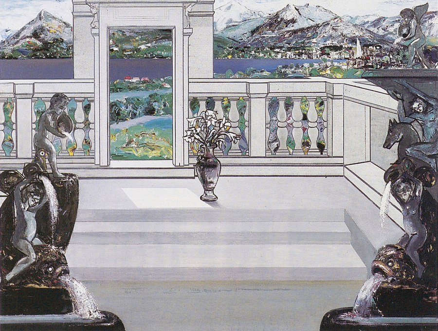 Le vrai sujet du deuxième tableau est l’eau (…) Encadrée par cette eau que versent différents petits personnages et animaux mythiques de sexe masculin, Suzanne, sur le pas de la porte de son palais, fragile apparition, semble hésiter un dernier instant avant de quitter définitivement le lieu où elle vient d’être agressée. Un paysage toscano-babylonien rappelle à la fois la source littéraire de l’histoire et la source picturale de l’image.